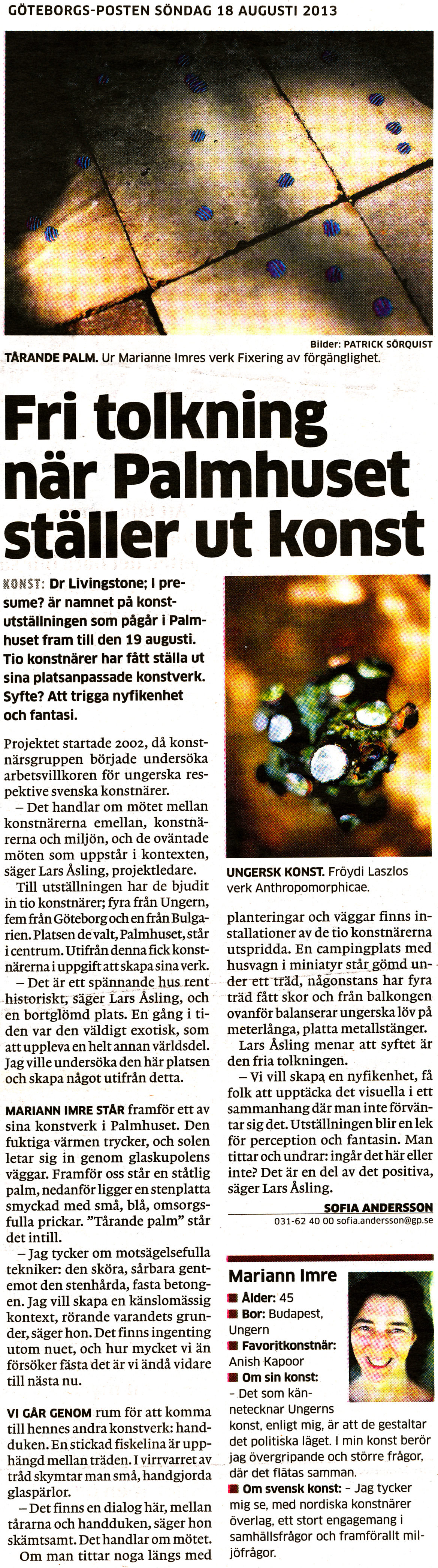 Trevlig artikel om vår utställning! – Kom idag i G-P. Bild ~ 18 augusti, 2013 ~ Peter Hefner Dela detta: Dela på Facebook (Öppnas i ett nytt fönster) Facebook Dela på LinkedIn (Öppnas i ett nytt fönster) LinkedIn E-posta en länk till en vän (Öppnas i ett nytt fönster) E-post Skriv ut (Öppnas i ett nytt fönster) Skriv ut Dela på Tumblr (Öppnas i ett nytt fönster) Tumblr Gilla Laddar in …